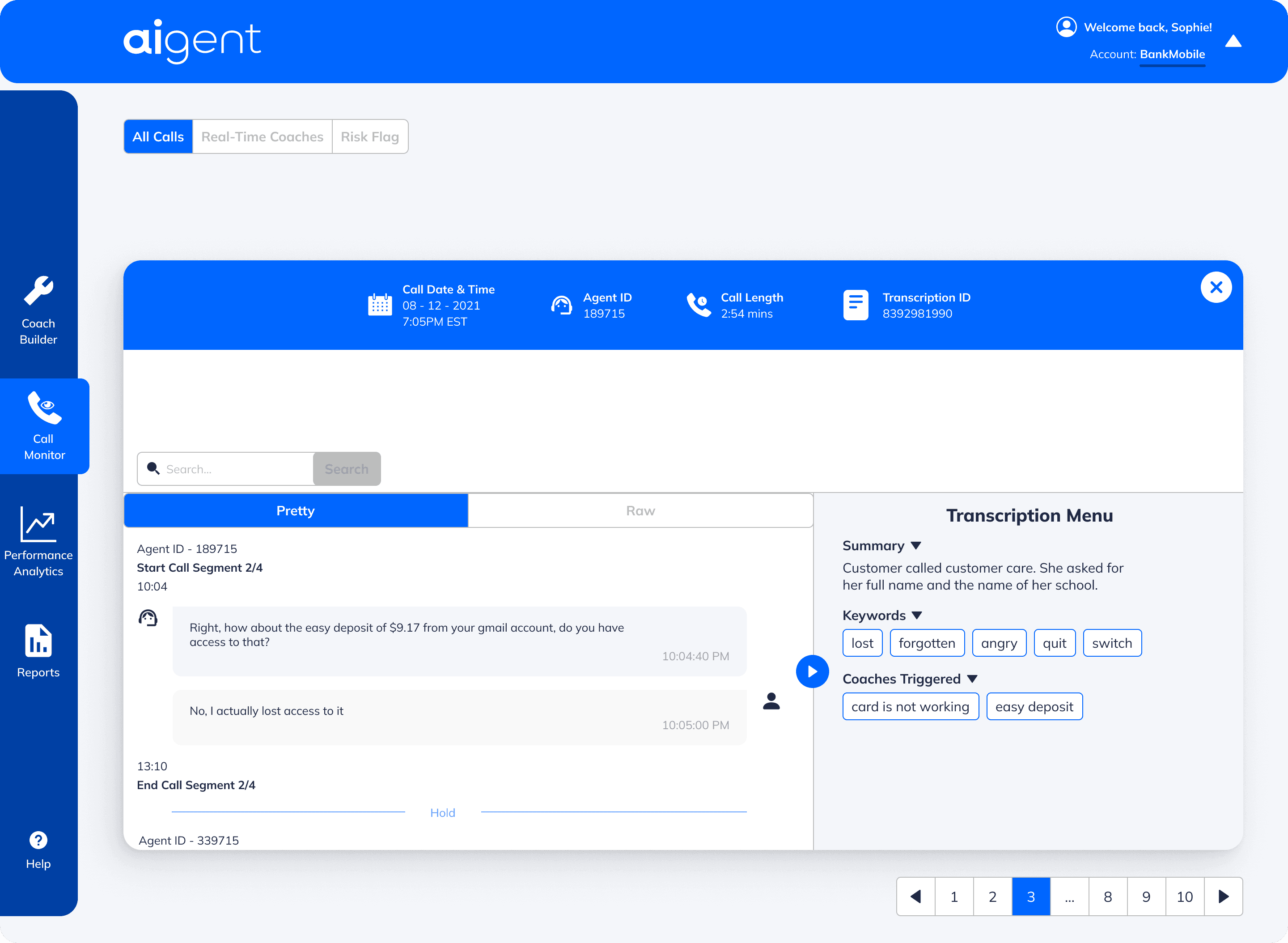 Structured transcription view surfaces key insights from each call