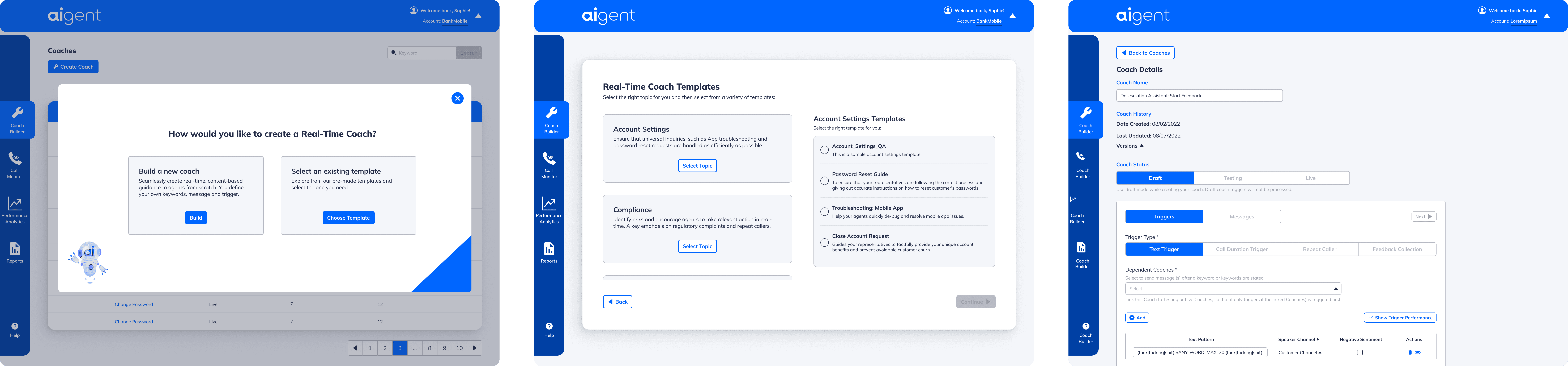 Once issues were identified, users needed a way to improve future calls. I designed flows to create and manage “coaches” (rules/triggers for AI behavior).